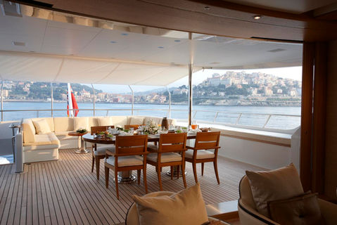 One of the most popular spots aboard KATHLEEN ANNE is her sun deck. With plenty of space for those who wish to sunbathe, an ingenious shade system with cantilevered umbrellas makes it appealing to all. Guests can enjoy the elevated views from the Jacuzzi or the sweep of cushioned sun pads, and a dining table completes the setup. Gym equipment can also be setup on the sun deck, extending the usability of this fantastic space further still.